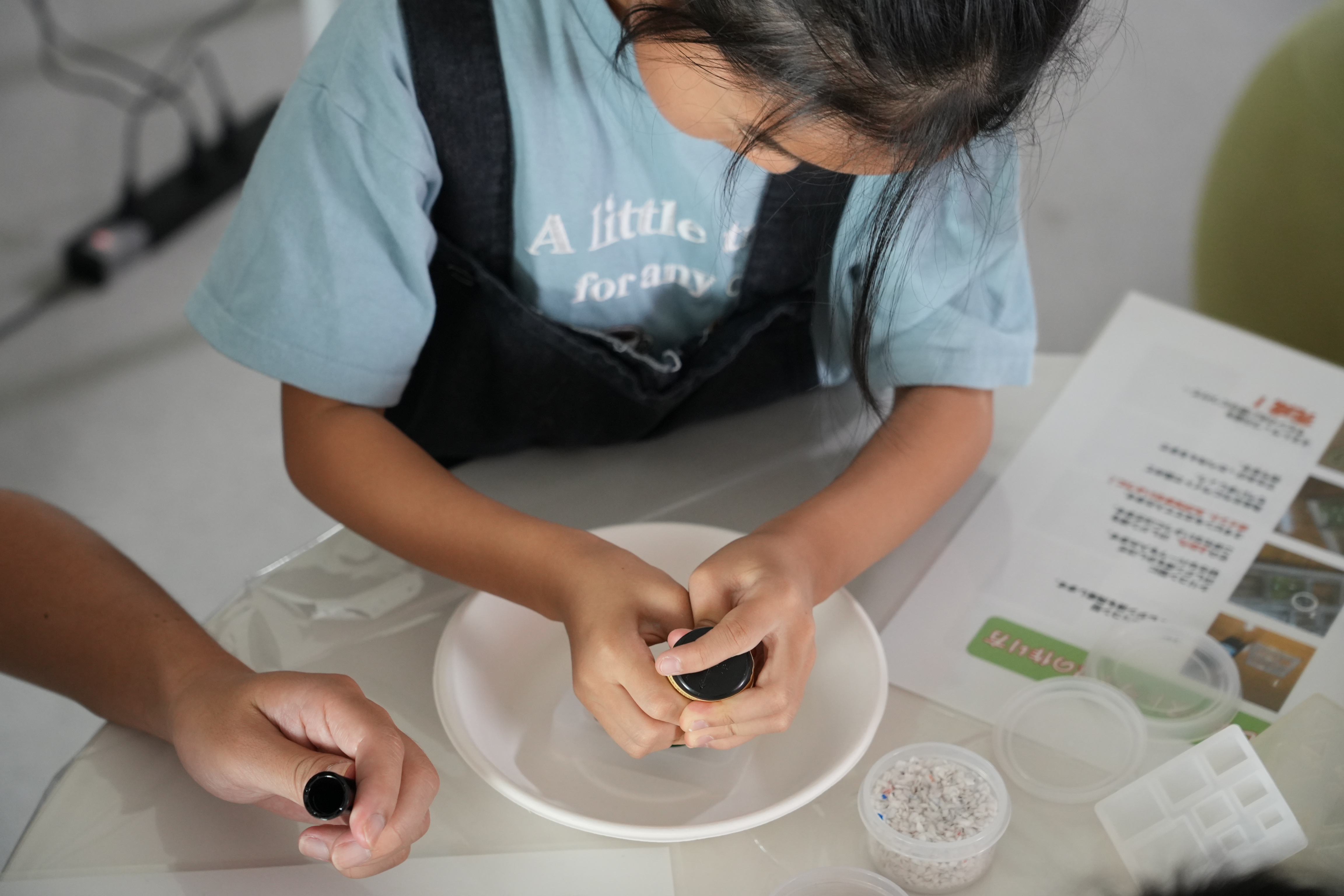 参加者には、電子機器の部品を活用して、オリジナルのレジン小物(マグネットやストラップなど)づくりも体験いただき、